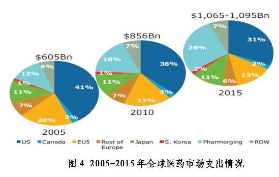 到2015年,美國占國際醫藥市場支出的份額將從2005年的41%下降到31%,而位于國際醫藥市場支出份額第五名的歐洲的國家也將從20%下降到13%。同時,17%高增長新興市場將有中國引領,到2015年它所占份額將從2005年的12%上升到28%。(數據來源:IMS Market Prognosis, Apr 2011)