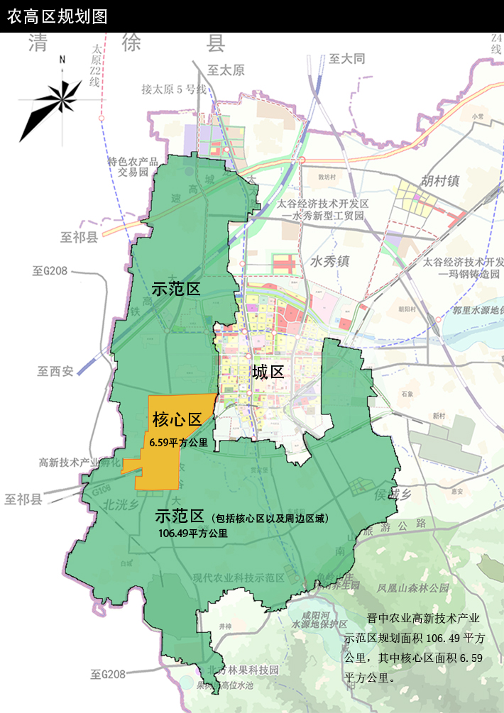 晉中農高區核心區位于農高區西部,北至箕城街,東至108國道、北洸村東,南至南洸村北部,西至北洸村東、曹莊村東。規劃面積為6.59平方公里。