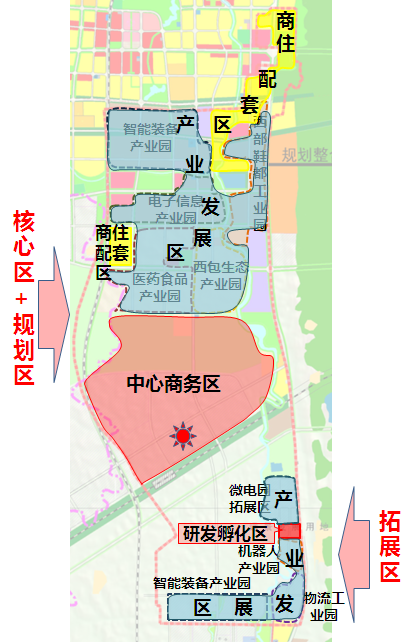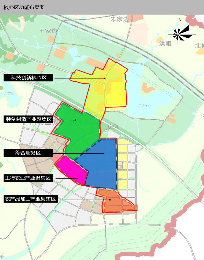 核心區東至環鎮東路、南至老明公路和S341、西至貫莊路、北至寧杭城際鐵路,用地8.24平方公里,包括科技創新集聚區、生物農業產業集聚區、農產品加工產業集聚區、智能裝備制造產業集聚區以及生活綜合服務區。此區域經濟發展水平較高、科教資源豐富,重點培育生物農業、農產品加工、智能裝備制造等高新技術產業。