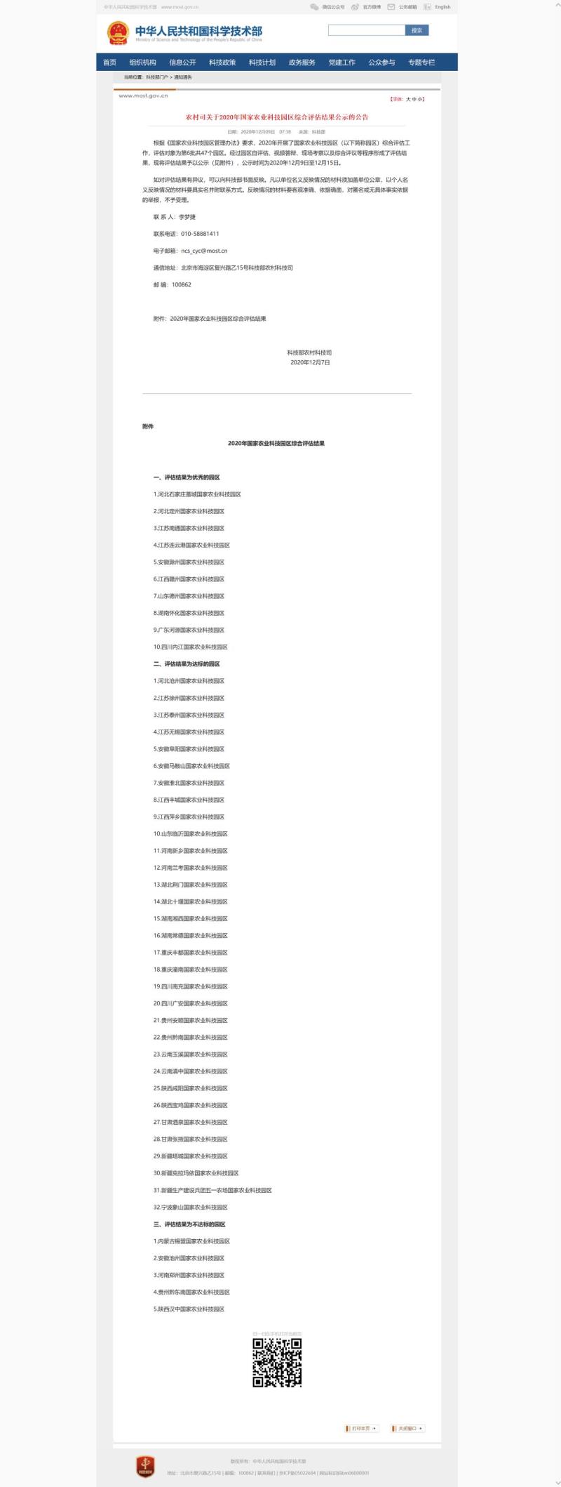 附:科技部農村司關于2020年國家農業科技園區綜合評估結果公示的公告