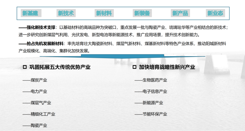 陽城縣國民經濟與社會“十四五”規劃提出,聚焦“六新”方向,規劃布局“新基建”,攻關突破“新技術”,加快研制“新材料”,著力打造“新裝備”,抓緊開發“新產品”,積極培育“新業態”;鞏固拓展五大傳統優勢產業,持續做深“煤”、做穩“電”、做精“化”、做長“氣”、升級“瓷”;加快培育新能源、生物醫藥、節能環保、電子信息等戰略性新興產業,加快推進工業提速轉型,構建現代產業新體系,實現工業高質量高速度發展。
